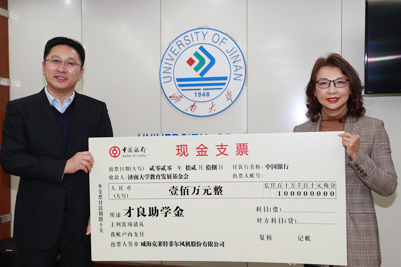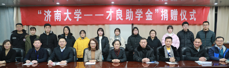 12月18日,“濟南大學—才良助學金”捐贈儀式在濟南大學第一會議室舉行。威海克萊特菲爾風機股份有限公司總經理、濟南大學威海校友聯誼會會長、89級機械專業盛軍嶺校友向濟南大學教育發展基金會捐贈100萬元,繼續注資“才良助學金”用于幫助大一困難新生。威海校友代表張國、于杰、姜紅軍、滕昭琪等出席儀式,黨委副書記、教育發展基金會理事長張碩秋,學工處、合作發展處、校友工作辦公室、教育發展基金會辦公室相關負責同志、才良助學金受助學生代表等參加捐贈儀式。