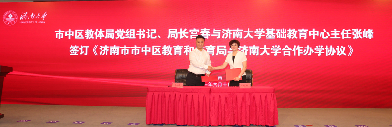 6月10日,濟南市市中區人民政府、濟南大學共同推進基礎教育戰略合作簽約暨濟南大學附屬學校揭牌儀式在學校第一學術報告廳舉行。山東省教育廳副廳長戴龍成,濟南市教育局局長王品木,濟南市中區區委書記韓永軍、區長翟立波,濟南大學黨委書記徐景顏、校長張士強,學校有關領導,市中區教體局相關領導、學校相關職能部門負責人出席簽約揭牌儀式。儀式由副校長楊景波主持。