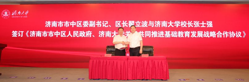 濟南大學黨委書記徐景顏、市中區區委書記韓永軍分別致辭;市中區區長翟立波與濟南大學校長張士強共同簽訂《濟南市市中區人民政府、濟南大學關于共同推進基礎教育發展戰略合作》協議;濟南市市中區教體局黨組書記、局長宮春與濟南大學基礎教育中心主任張峰簽訂《濟南市市中區教育和體育局與濟南大學合作辦學協議》。戴龍成與徐景顏為濟南大學附屬學校(舜文)揭牌,王品木與張士強為濟南大學附屬學校(舜苑)揭牌。